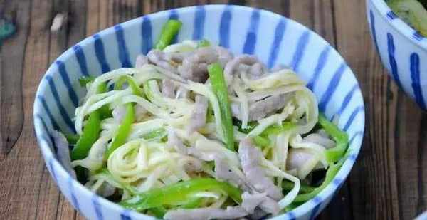 3.加鹽加肉絲翻炒均勻,放入青椒絲和少許蝦粉翻炒均勻出鍋。