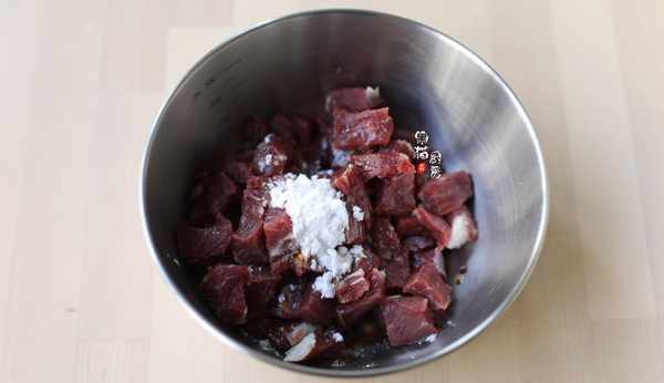 3.牛肉切成塊,大概和拇指般大小的塊狀即可。分別加入淀粉、料酒和少許橄欖油調勻醃制。