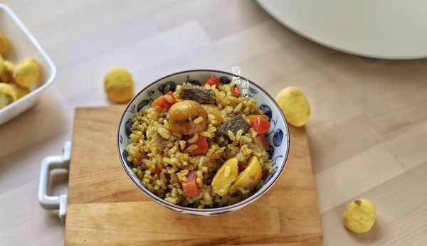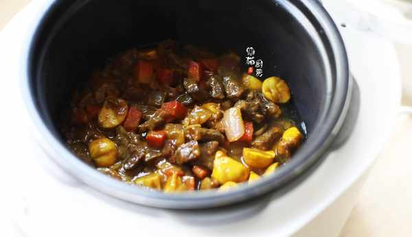 9.炒好的板栗牛肉平鋪在糙米飯上。蓋上鍋蓋,選擇電飯鍋“快速飯”功能,時間30分鐘,足夠把糙米飯壓煮熟。