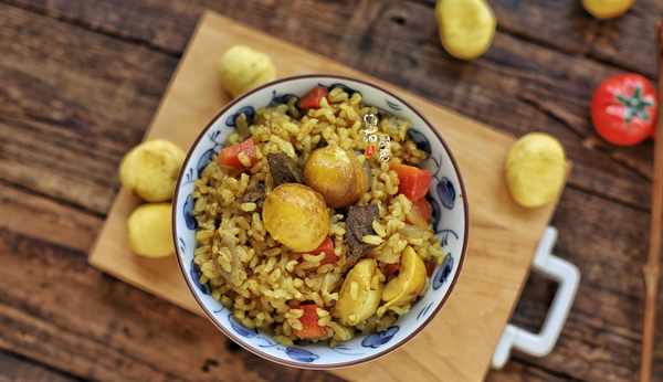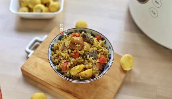 食材:牛肉300克,胡蘿卜1根,板栗10顆,糙米100克,清水(煮糙米飯)100克,洋蔥半個,黃咖喱醬1茶匙,橄欖油5-10克,鹽少許,淀粉半茶匙,料酒1茶匙。