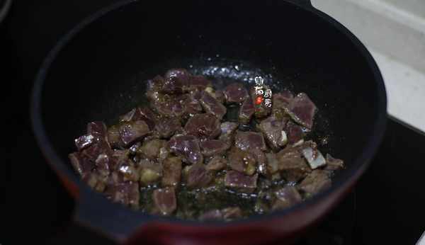 5.炒鍋加熱,倒入適量橄欖油,把牛肉塊倒入鍋中,翻炒至斷生。