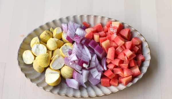 4.洋蔥、胡蘿卜切塊,板栗對半切開或者一分為四。