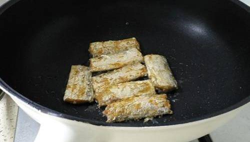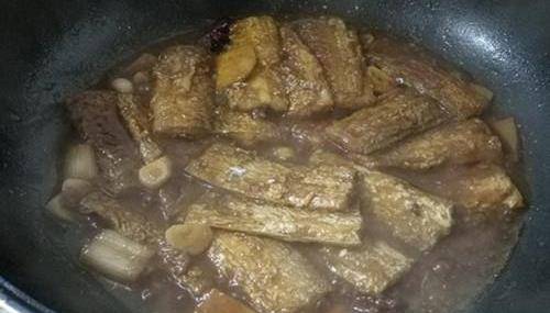 原鍋倒出炸油,鍋中留下大約1大勺油,下入切好的薑片,蔥段以及紅辣椒爆炒香味,放入煎炸過的帶魚,碗中放入三勺生抽,一勺老抽、一勺香醋、一勺料酒、一勺蠔油、一勺糖混合均勻。煎好的帶魚下鍋後直接加入調好的料汁燉煮,隨即倒入沒過帶魚的熱水,蓋蓋轉小火燉至十分鐘左右即可。
