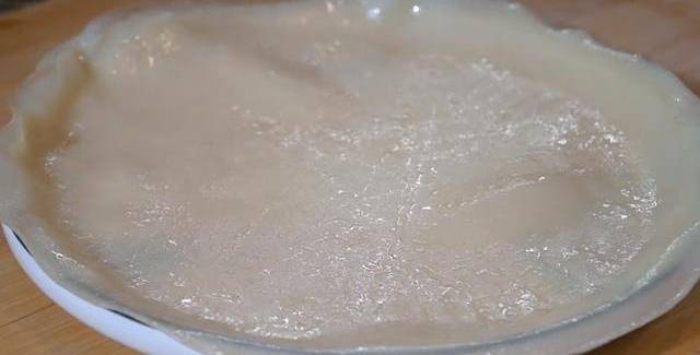 5,2分鐘後開蓋輕輕地揭下,非常筋道透亮的涼皮就做好瞭,切成條裝入碗中。
