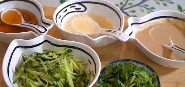 3,準備好所需的配料:碗中加入一勺麻醬用溫水解開。大蒜切末放入碗中加入食鹽用搟面杖搗碎加入清水攪拌做成蒜汁水,一根黃瓜切成細絲,香菜切碎,再做一個調料水,鍋中加入清水放入花椒,香葉,小茴香煮3分鐘,濾掉調料,做成調料水。