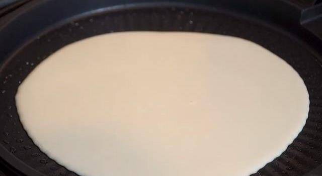 4,電餅鐺刷油預熱2分鐘關火,舀上一勺面糊,晃動電餅鐺均勻攤平,用電餅鐺的餘溫燜上2分鐘。