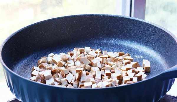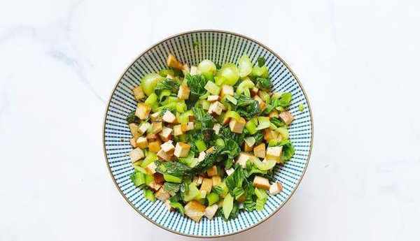 3.青菜洗凈後入開水汆燙10秒,撈出後用冷水沖過再泡入冰水,完全冷卻後撈出切成小丁