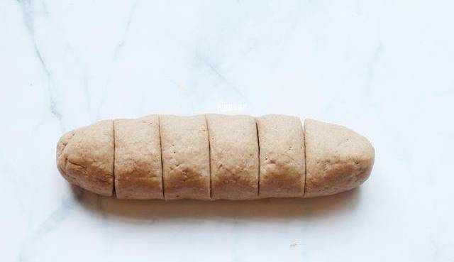 5.發酵好的面團是原來的兩倍大,戳孔不回縮,取出排氣。搓成長條狀,分成大小相等小劑子