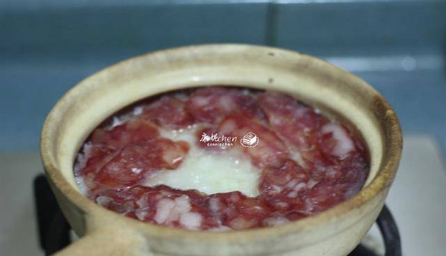 3當米飯煮到一定程度,放上臘腸片,大米有肉香,特別好吃。