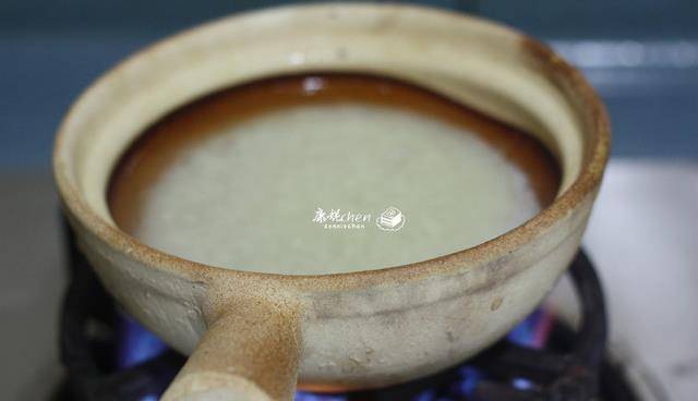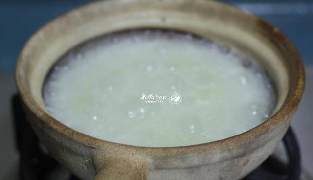 4浸泡好的大米,大火燒開煮沸,轉中小火,邊煮邊轉一下砂鍋,讓整個鍋受熱均勻