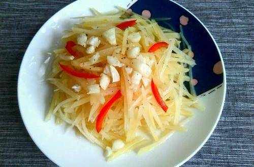 土豆(大):1個、鹽:適量、涼拌醋:適量、花生油:適量、花椒:適量、大蒜:兩瓣、清水:適量、黑胡椒:少許、彩椒絲:少許