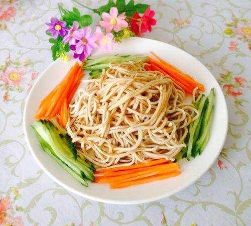 豆腐皮:250克、黃瓜:80克、胡蘿卜:80克、生抽:兩湯勺、米醋:三湯勺、鹽:適量、胡椒粉:少許、辣椒粉:少許、芝麻油:適量、溫開水:適量