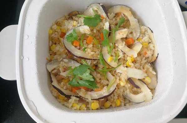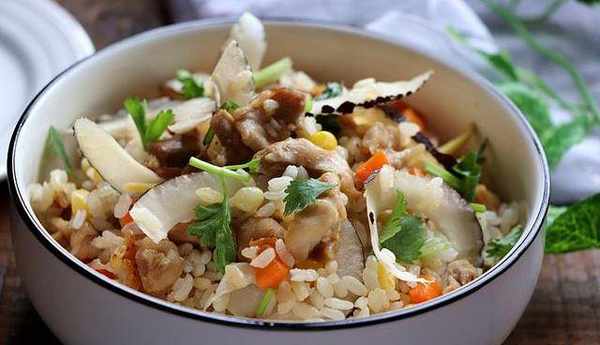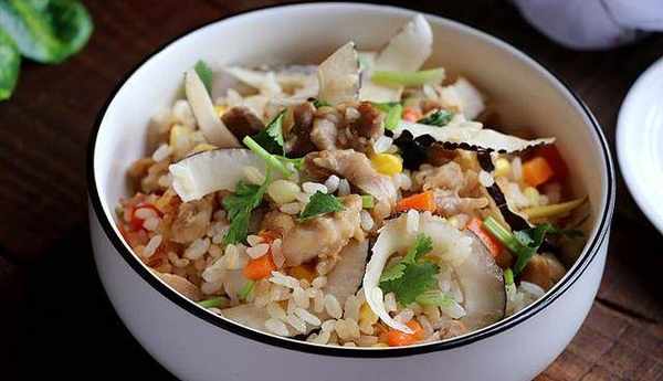 放進玉米粒,胡蘿卜粒,椰子片,最後加入醃好的雞腿肉,淋點香油