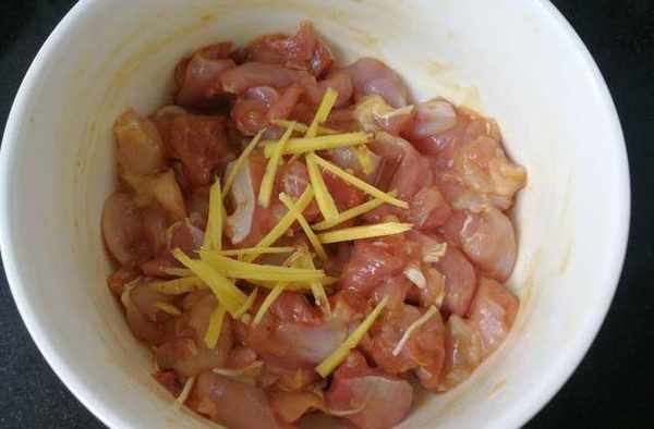 把雞腿去皮,去骨,把肉切小顆,加入鹽、糖、酒,蠔油,醬油,把雞腿肉與薑絲一起醃上十分鐘,待用