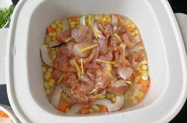 大米150克,雞腿肉,2隻,椰子70克,玉米20克,胡蘿卜20克,薑,5克,香菜