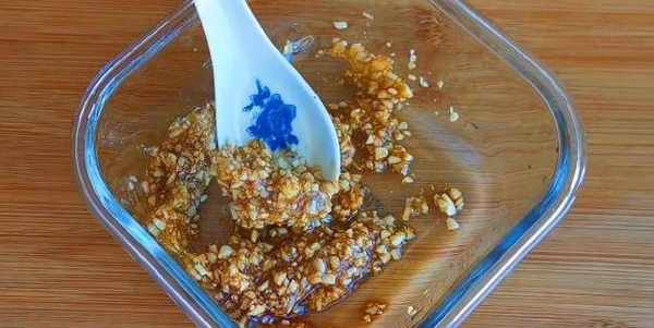 3.調醬汁:切點蒜末裝進碗裡,加一勺鹽,一勺蠔油,一勺生抽,攪勻備用。