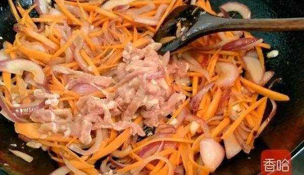 5.胡蘿卜絲炒到微軟就把肉絲放進去快火快速炒肉絲五成熟就把面放進去