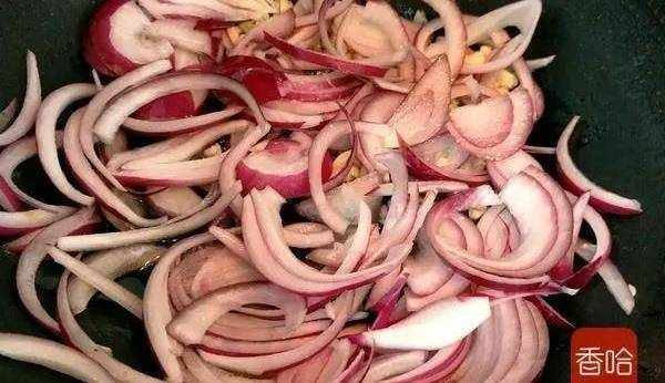 3.冷鍋放入蒜末 洋蔥煸香(冷鍋目的是使蒜末洋蔥慢慢加熱過程把香味融到油裡)