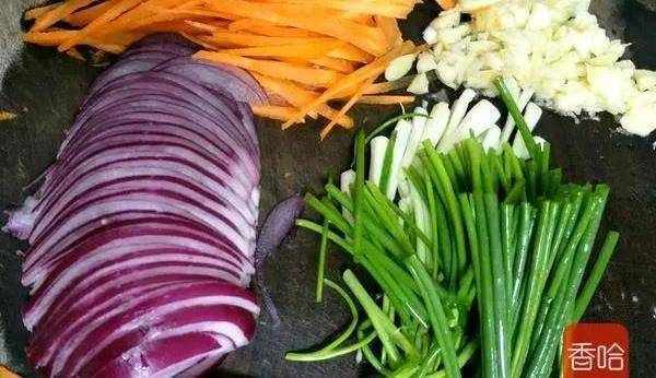 2.豬肉切細絲加入生粉 油 胡椒粉 五香粉 醬油 拌均勻入味30分鐘,把胡蘿卜 洋蔥切絲 蔥切段 蒜頭剁成泥備用