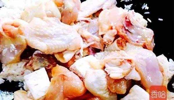 14.同樣的翻炒均勻,炒至雞肉4成熟即可。