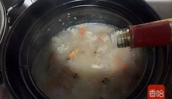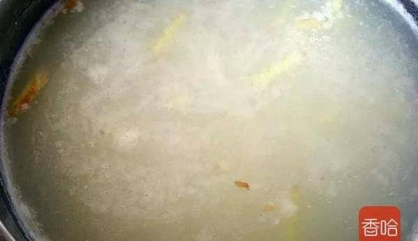 6.起鍋,把水燒開,倒入大米和薑絲,小火慢煮。煮的過程中攪動幾次,以免糊鍋