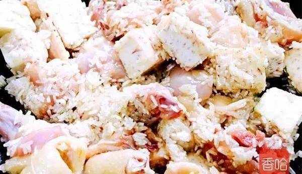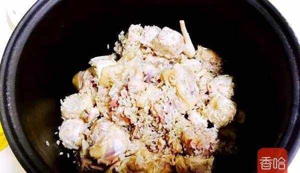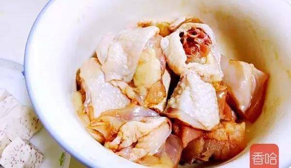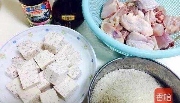 1.準備好食材,雞洗凈切件,芋頭去皮切塊,米掏洗幹凈。(漏拍瞭料酒和鹽)