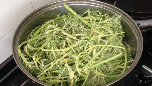 第四步:處理好的茼蒿就可以上鍋蒸瞭,這一步也要特別的強調一下,蒸菜必須是開始上鍋蒸,千萬不能涼水上鍋,否則,就會粘成妥妥的一大團,茼蒿放入後,蓋上鍋蓋大火蒸2-3分鐘就可以瞭。