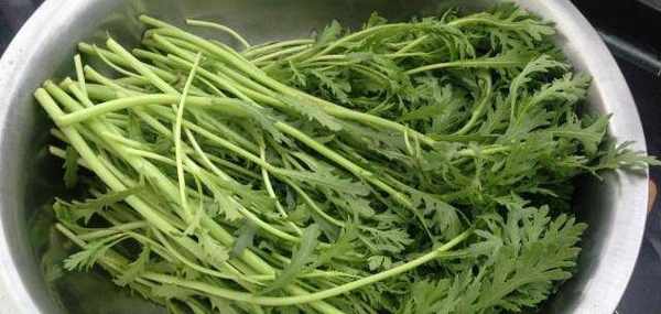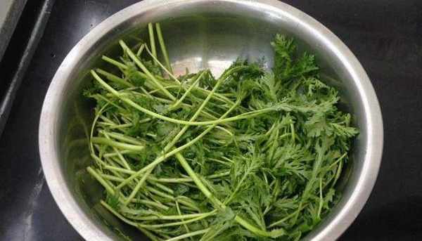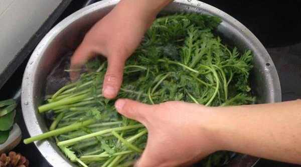 第一步:先用清水將茼蒿清洗幹凈,由於茼蒿較為脆嫩,特別容易發黑,所以,清洗的時候用力一定要輕柔一些,清洗兩遍就可以瞭。