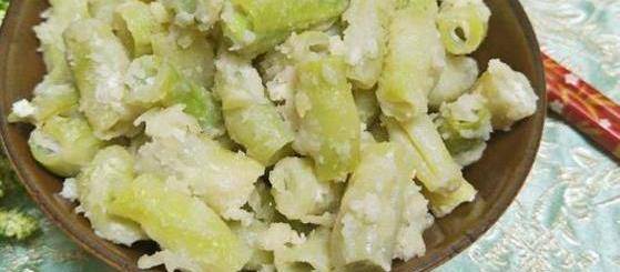 食材:老豆角300克、面粉、大蒜、香油、鹽、適量。