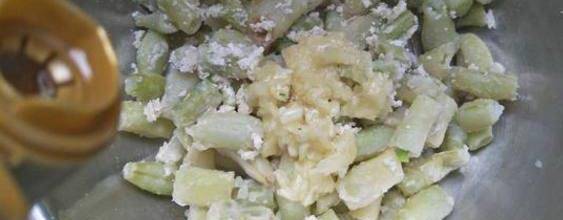 10、把豆角取出放入盆內,熱氣散瞭以後,放上蒜泥,加幾滴香油,用筷子撥散。