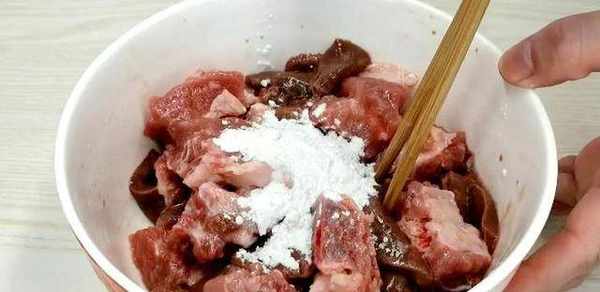 加2勺紅薯淀粉,攪拌均勻,讓淀粉把把豬肝和排骨都包裹起來,這樣的做法可以讓豬肝和排骨保持鮮嫩多汁。