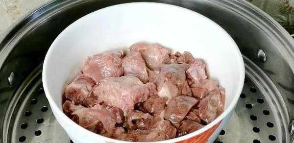 攪拌好後放蒸鍋蒸10分鐘。是不加水的幹蒸,當然碗裡不加水,但鍋裡是要加水的。這樣做的目的是讓裹在豬肝和排骨上的淀粉凝固,從而能夠更好地起到保護作用。