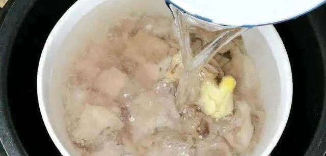 把薑塊放進去,生薑可以有效地去除豬肝和排骨的腥味,所以這塊薑是必不可少的。