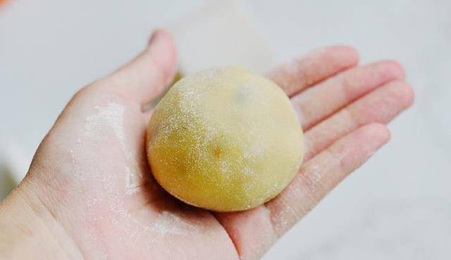 5:並在手上沾層薄薄的面粉,放上月餅餡轉動手,使月餅餡沾一層面粉。