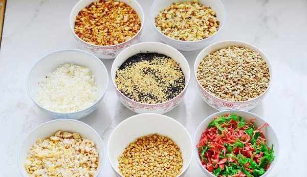 瓜子仁300g,桔餅100g,花生250g,黑芝麻100g,白芝麻100g,松仁80g,冬瓜丁80g,核桃100g,紅絲50g,綠絲50g,細砂糖250g,玉米油120g,白酒40g,水310g,熟糯米粉500g