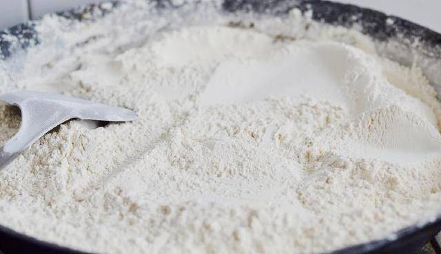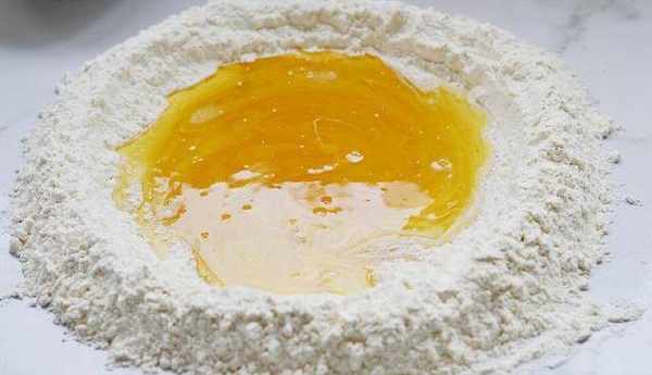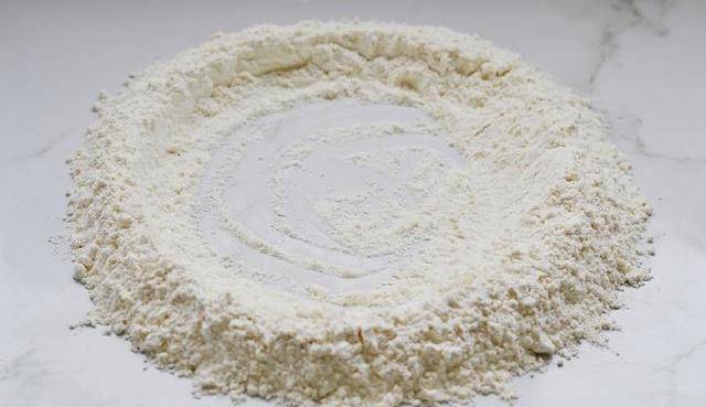 1:低筋粉倒在案板上,中間留出個空。