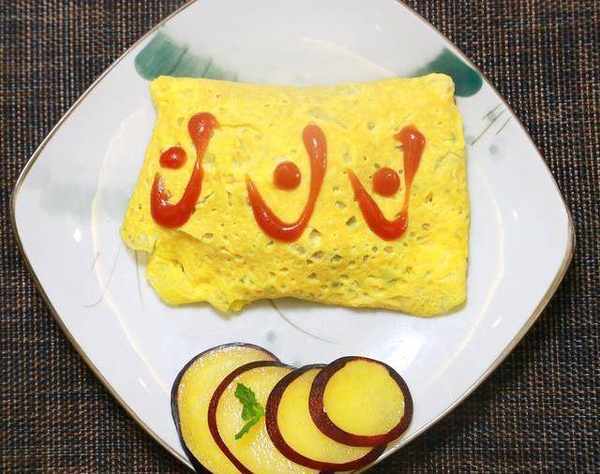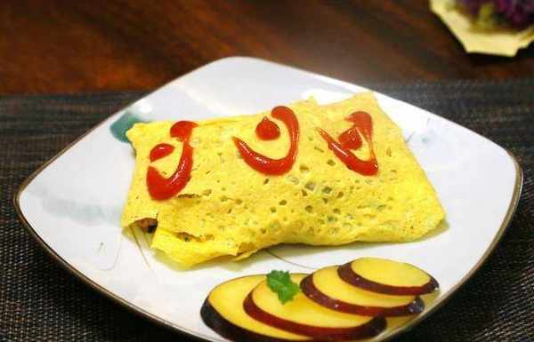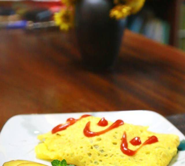 9,把制作完成的蛋包飯裝碟起鍋,放入少量的番茄汁,加點時令水果