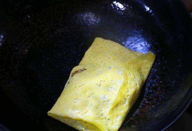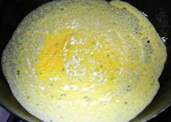 6,攤蛋餅,這一步是最關鍵,攤不好蛋餅就算失敗,新手建議用不粘鍋。大火滑好油鍋馬上關火,調好的蛋液放一半到鍋中間,然後慢慢旋轉炒鍋,把蛋液攤成圓形