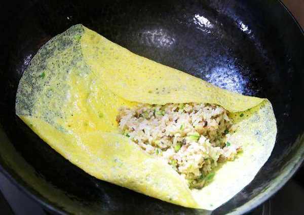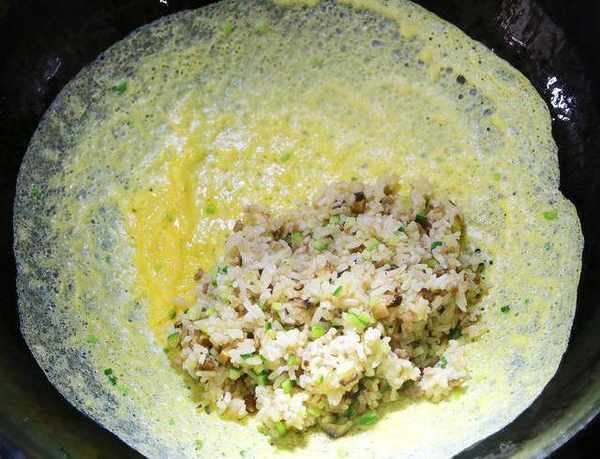 7,蛋液攤成這樣就算成功瞭,加入炒好的米飯