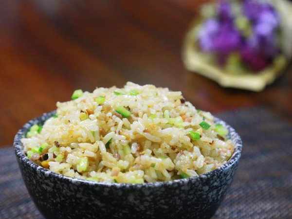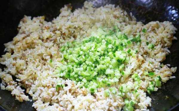 4,放入米飯翻炒,加入少量醬油、鹽、花椒粉調味,最後放入青瓜碎