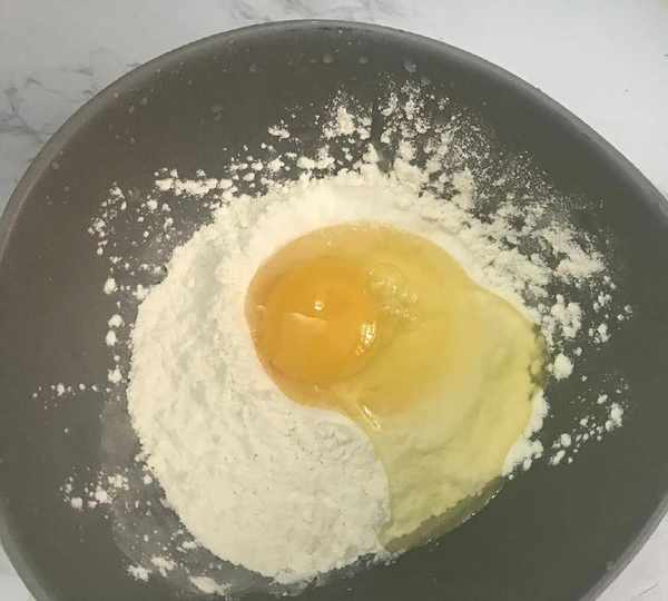 3、面粉放入碗中,加入雞蛋、鹽,適量清水,攪拌均勻,註意面糊不要太稀瞭,會掛不住。