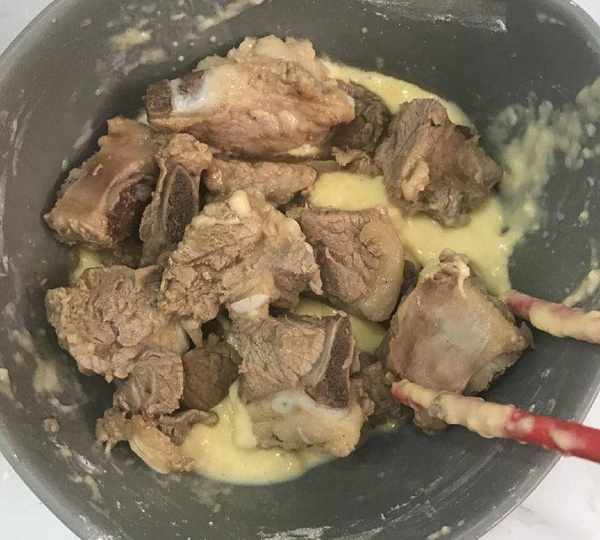 4、將醃制好的排骨放入碗中,用筷子攪拌一下,讓排骨都掛上面糊。
