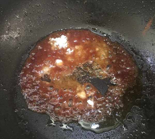 7、鍋中油倒出剩少許底油,加入番茄醬、白糖、醋、以及適量清水攪拌成濃稠狀。