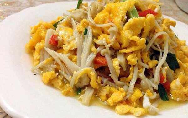 材料:金針菇250G;雞蛋3隻;小蔥;紅辣椒;食用油;料酒;鹽;雞精