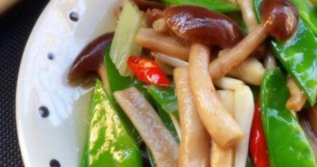 材料:茶樹菇、荷蘭豆、香芹、油、鹽、糖、生抽、蠔油、生粉、薑、蒜、紅辣椒
