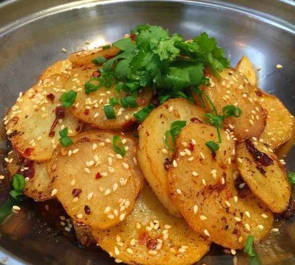 6、把煎黃的土豆片倒進去翻均勻,撒上適量辣椒面翻勻,然後裝幹鍋,撒蔥花白芝麻,點上酒精爐即可。