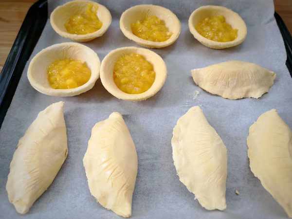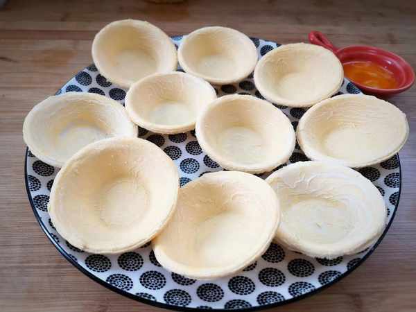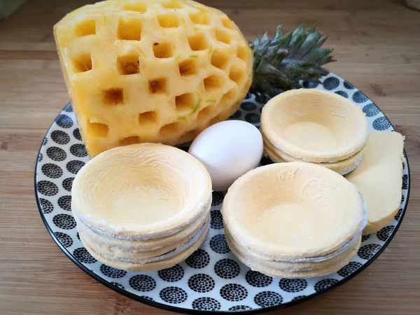 食材:菠蘿、蛋撻皮、蛋黃、黃油、白糖。