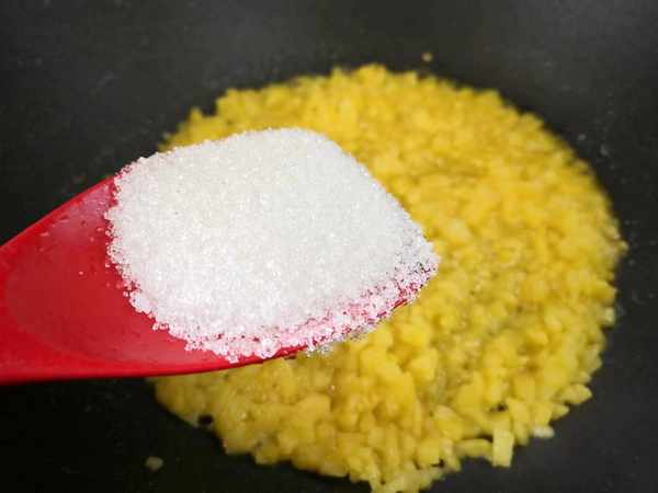 4、菠蘿從淡鹽水中撈出,控幹其中的水分,菠蘿切掉中間的硬芯,切成小丁越小越好,把一塊黃油放入鍋中,融化後加入菠蘿丁翻炒片刻,加入適量細砂糖。