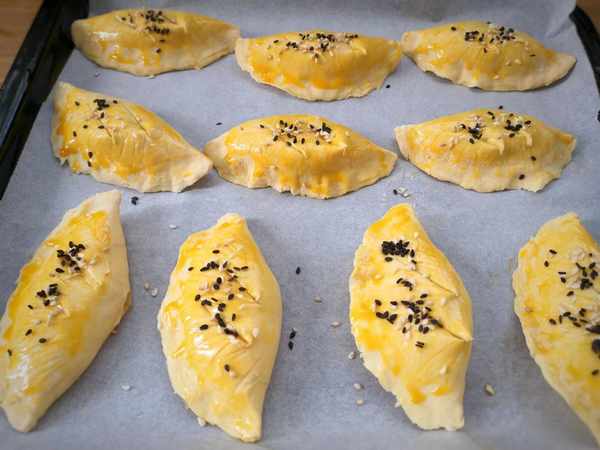 7、表面用小刀劃三道,再刷上蛋黃液,再撒上少許黑白芝麻,放入先預熱烤箱中。