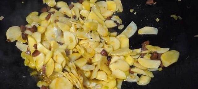 步驟二,起鍋,把鍋燒燙,然後倒入適量菜油不用加太多,倒入之前切好的蒜末,用鏟子翻炒兩下,爆炒出香味。大蒜的味道出來以後,把切成丁的臘腸倒進去,隨著翻炒幾下後,再把切成片的土豆片倒進去。開大火進行爆炒,然後往鍋中倒入食鹽。每塊土豆都煸炒進味,土豆外面還裹上瞭一層微黃色的菜油。炒得差不多瞭,往鍋中加水,蓋上鍋蓋,等水燒開。